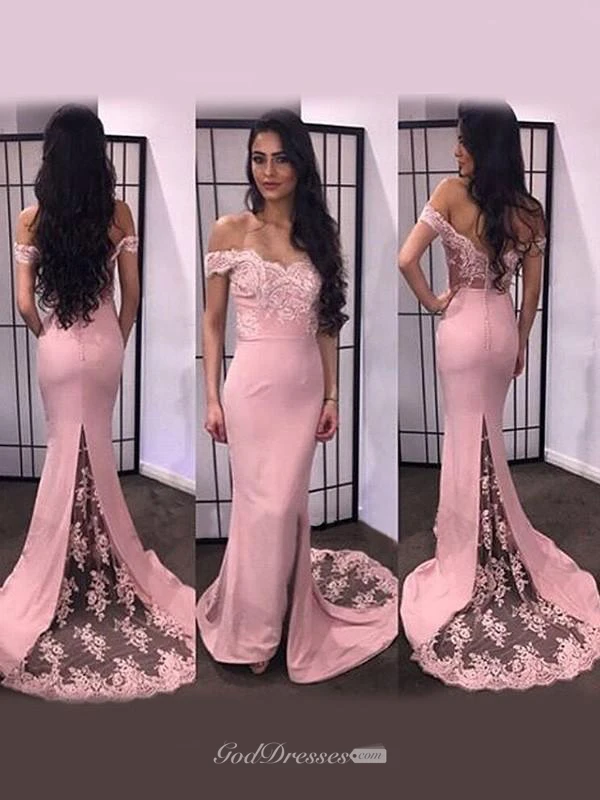 Mermaid Off-the-Shoulder Sleeveless Lace Satin Sweep Train Dresses