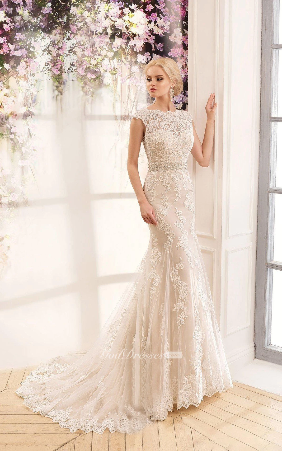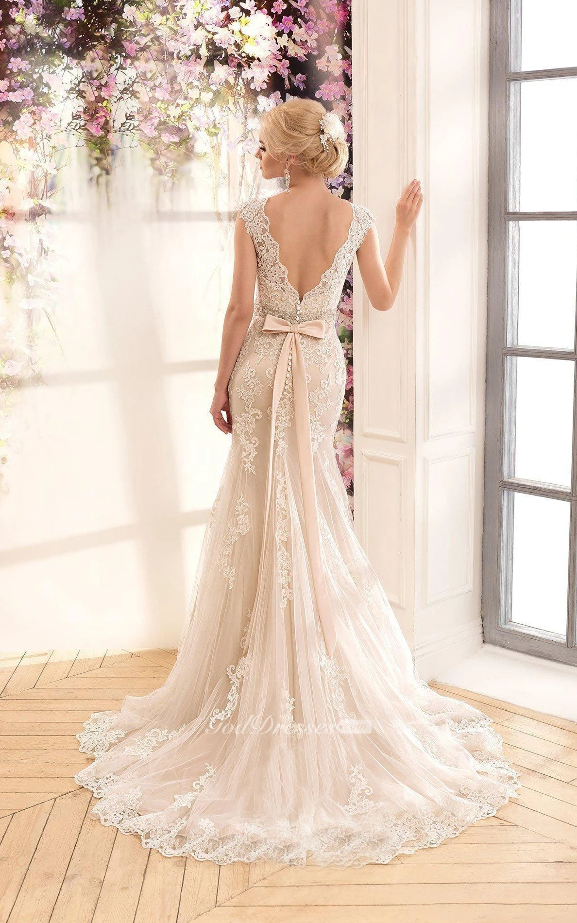 Mermaid Short Sleeveless Bell Cap Bat Beading Appliques Ribbon Brush Train Backless Lace Dress