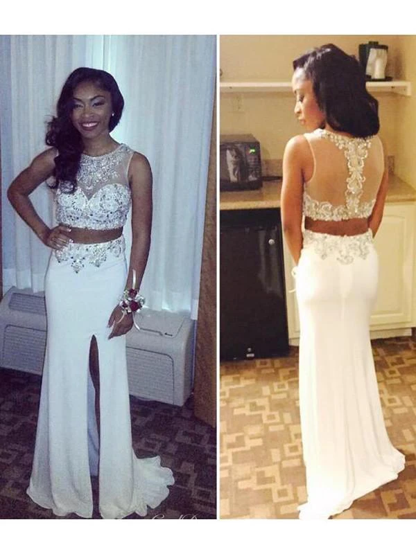 Mermaid Sleeveless Chiffon Scoop Beading Sweep Train Two Piece Dresses