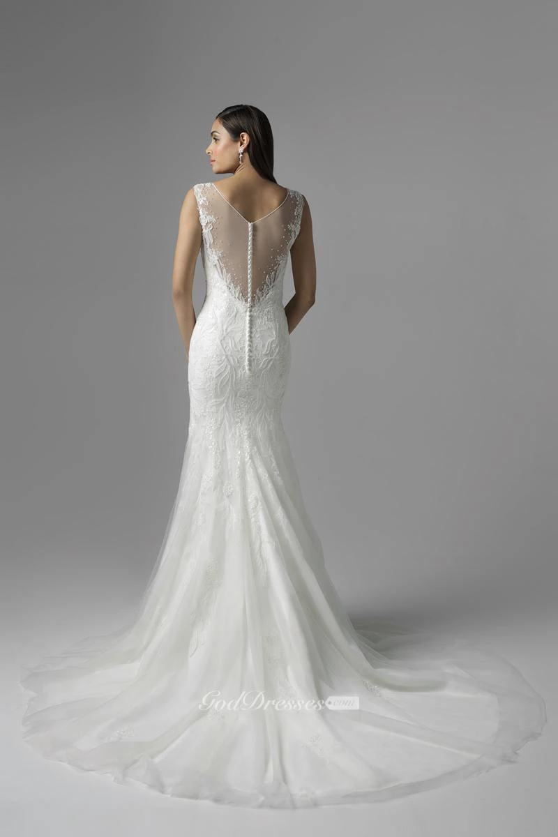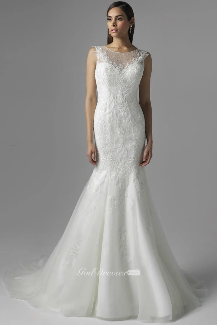 Mermaid Sleeveless Scoop-Neck Lace&Tulle Wedding Dress With Beading And Illusion
