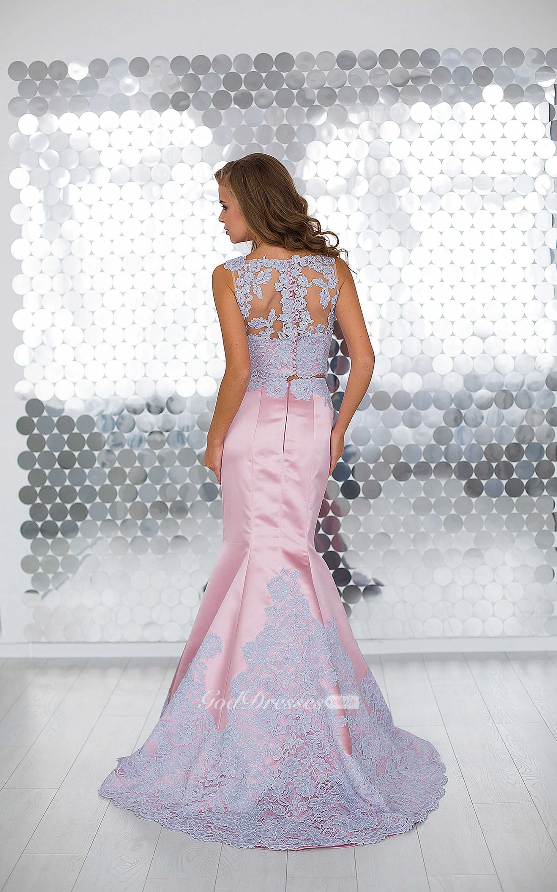 Mermaid Sweep Bateau Short Sleeve Satin Beading Lace Illusion Dress
