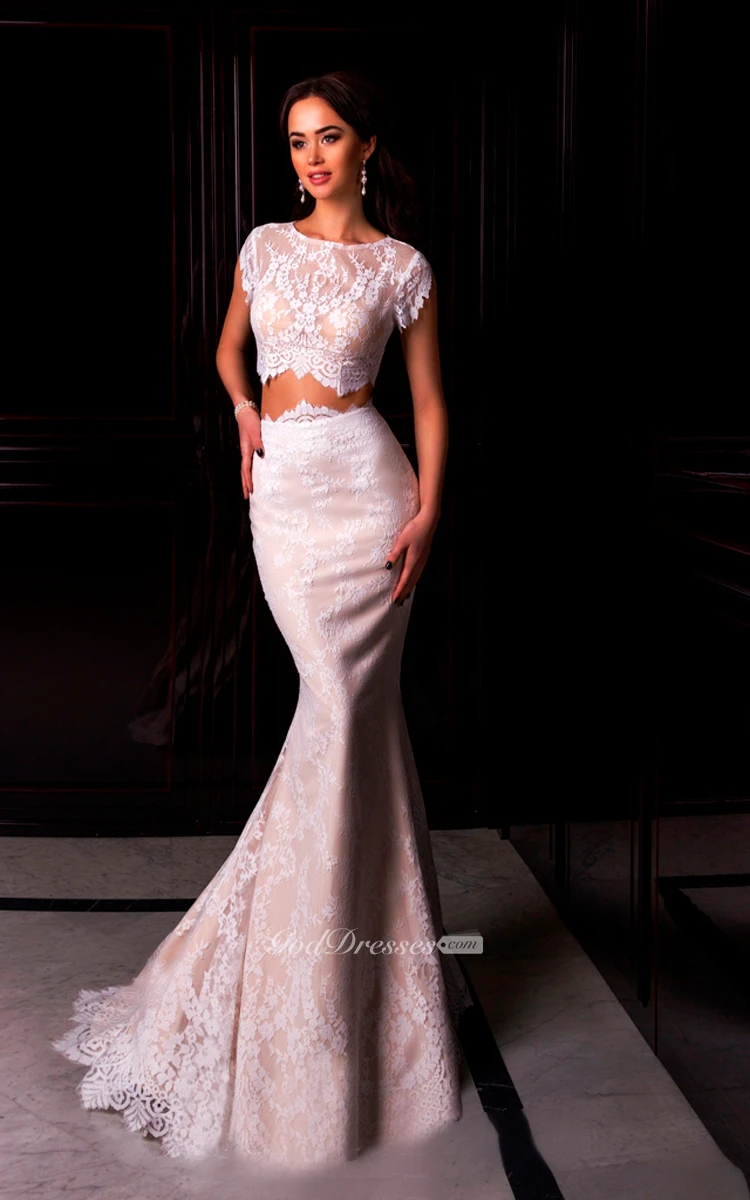 Mermaid Sweep Jewel Short Sleeve Lace Pleats Zipper Dress