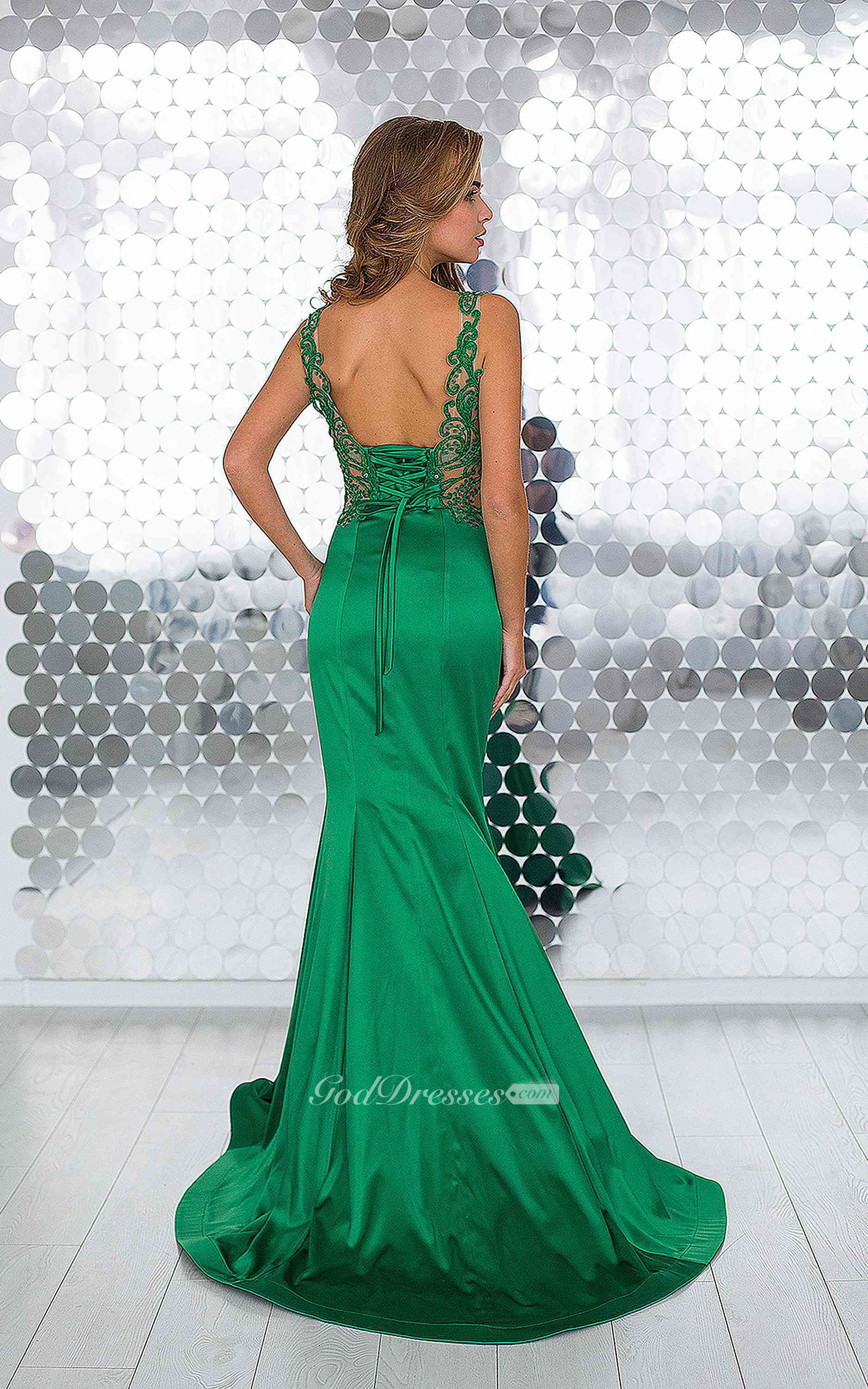 Mermaid Sweep Jewel Sleeveless Satin Appliques Beading Backless Dress