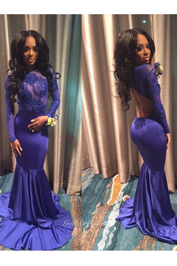 Mermaid Trumpet Satin Lace High Neck Long Sleeve Open Back Keyhole Dress