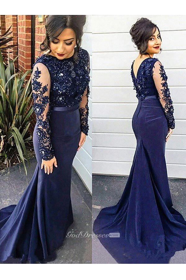 Mermaid Trumpet Satin Lace High Neck Long Sleeve Zipper Low-V Back Dress
