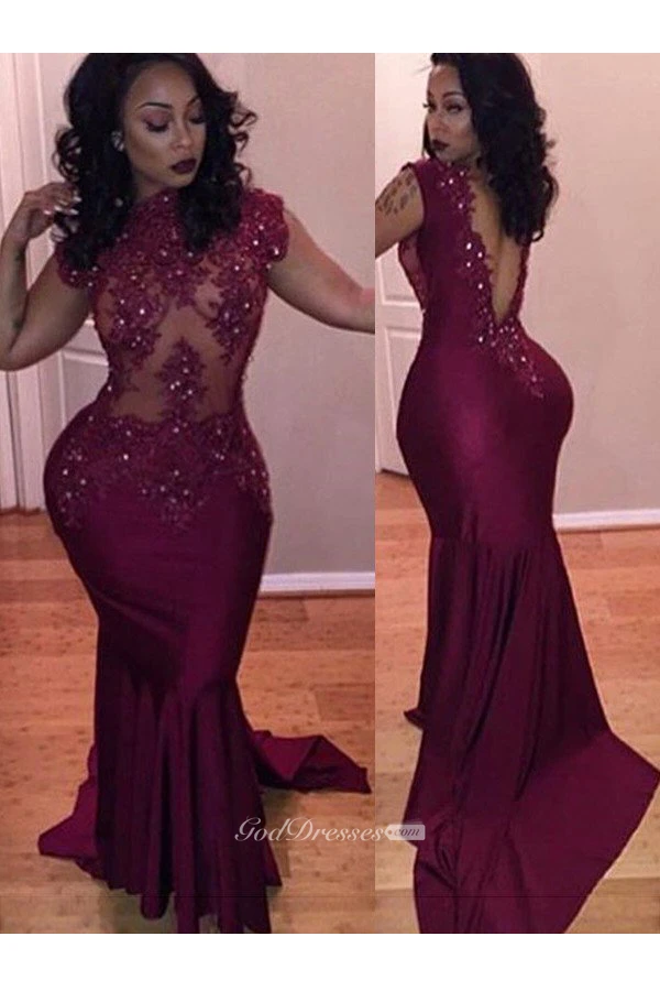 Mermaid Trumpet Satin Lace High Neck Short Sleeve Deep-V Back Dress