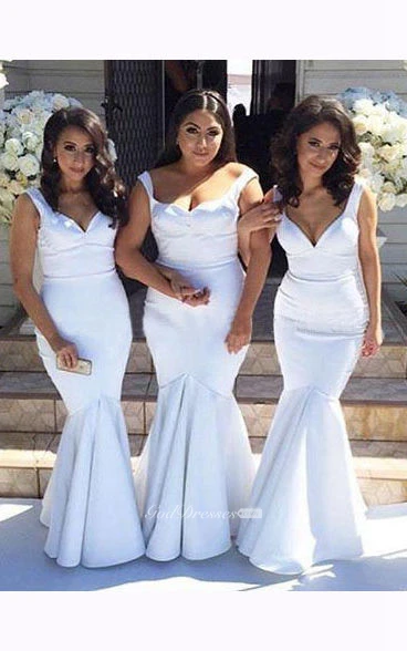 Mermaid V-neck Bell Pleats Floor-length Zipper Satin Dress