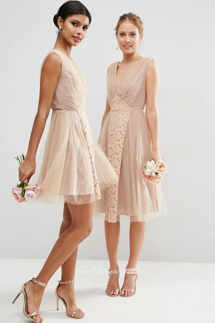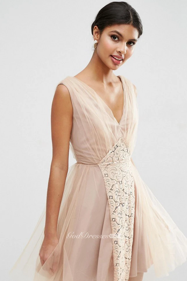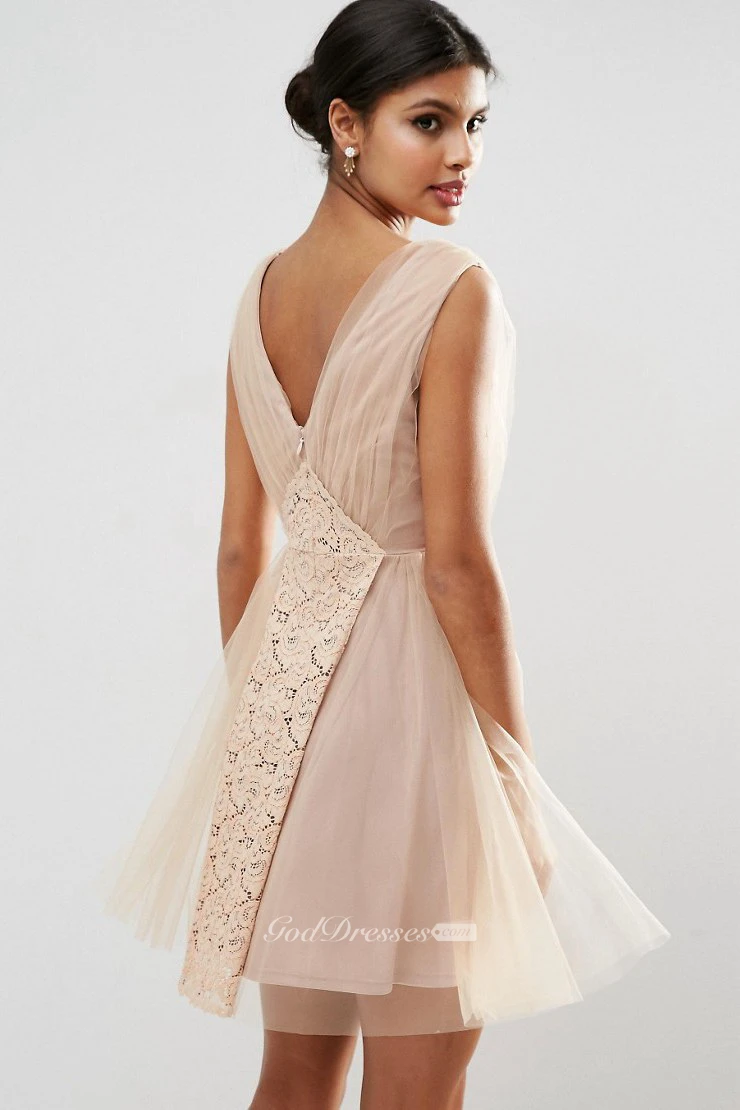 Mini A-Line V-Neck Sleeveless Lace Tulle Bridesmaid Dress With Ruching