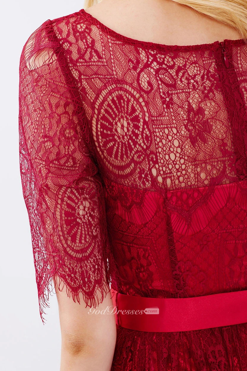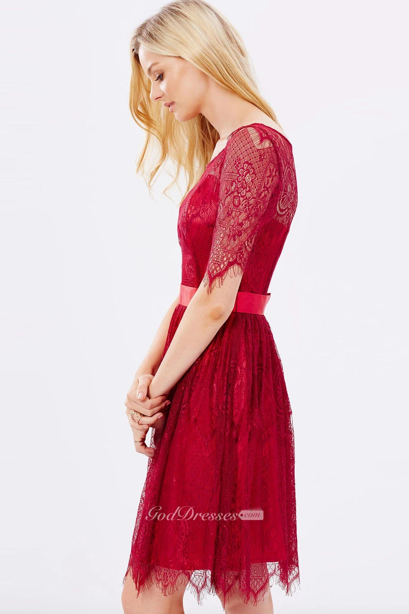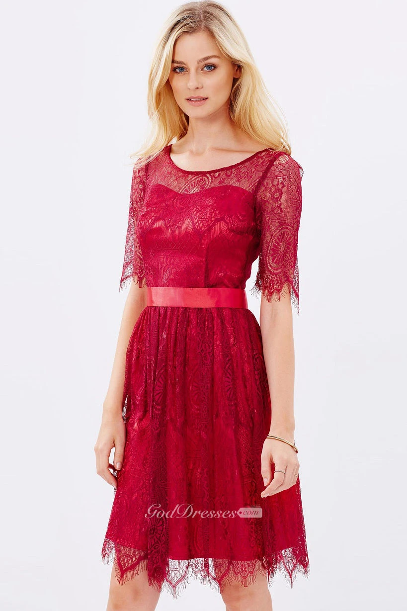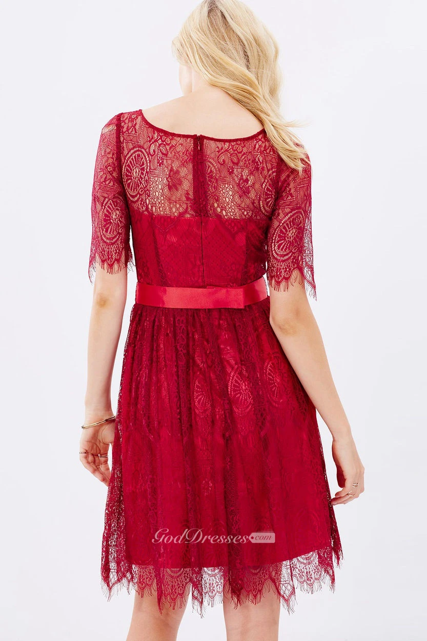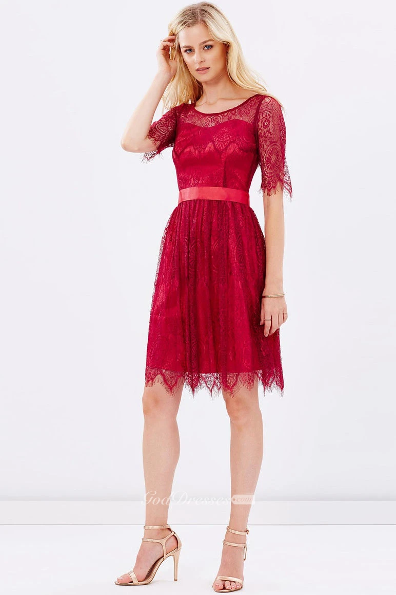 Mini Half Sleeve Scoop Neck Ribboned Lace Bridesmaid Dress