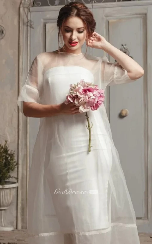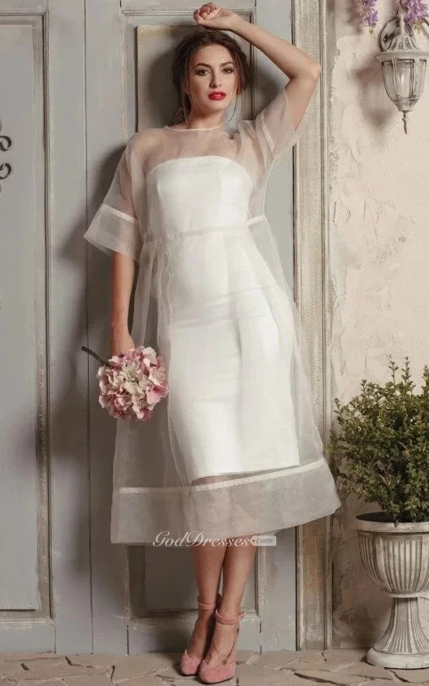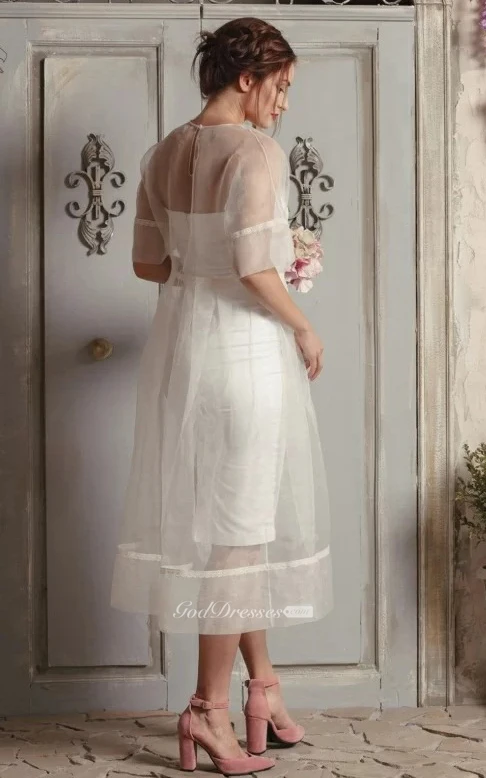 Modern A Line Organza Tea-length Half Sleeve Button Wedding Dress