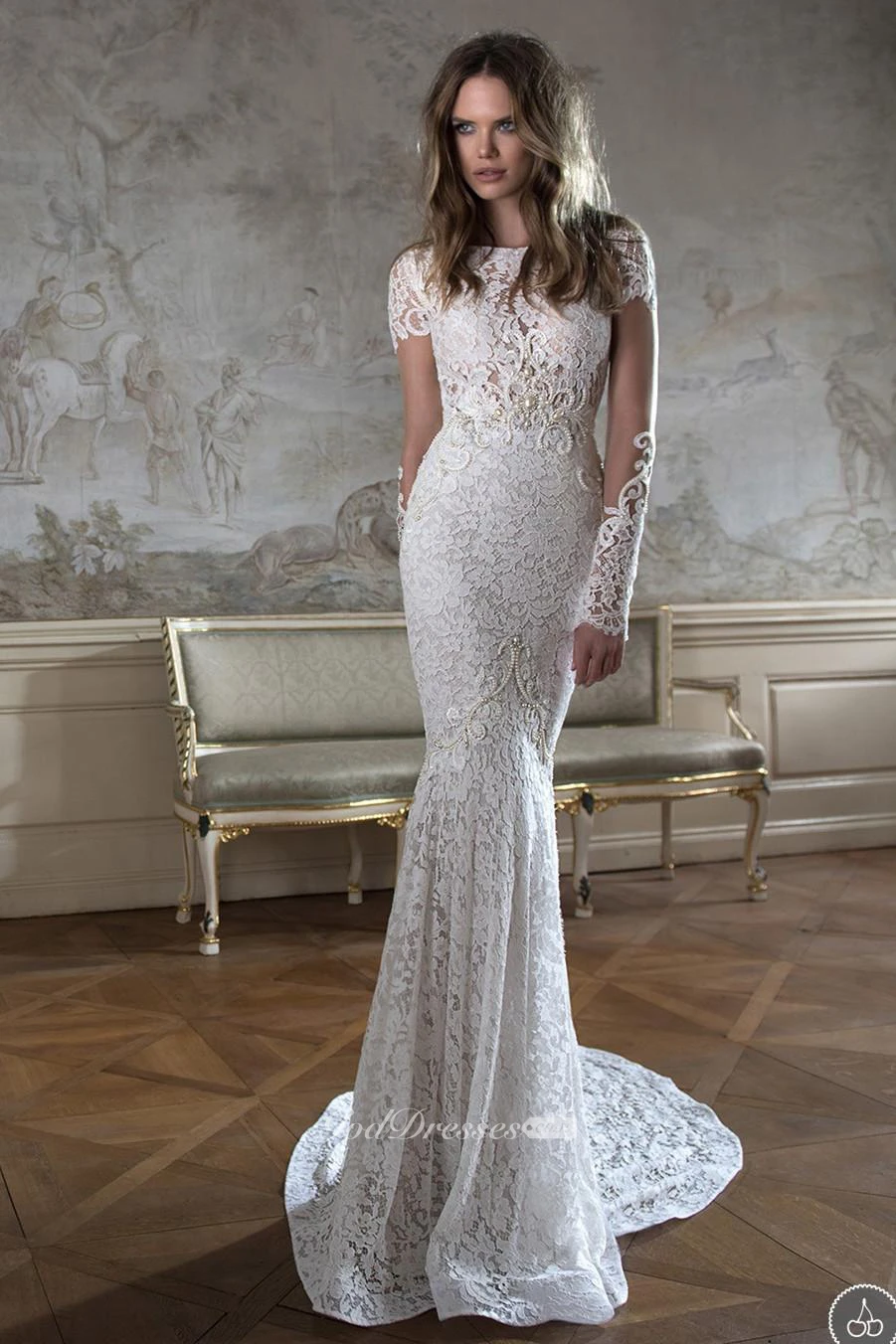 Modern Bateau Cap Sleeve Mermaid Wedding Dress Open Back With Lace Beadings