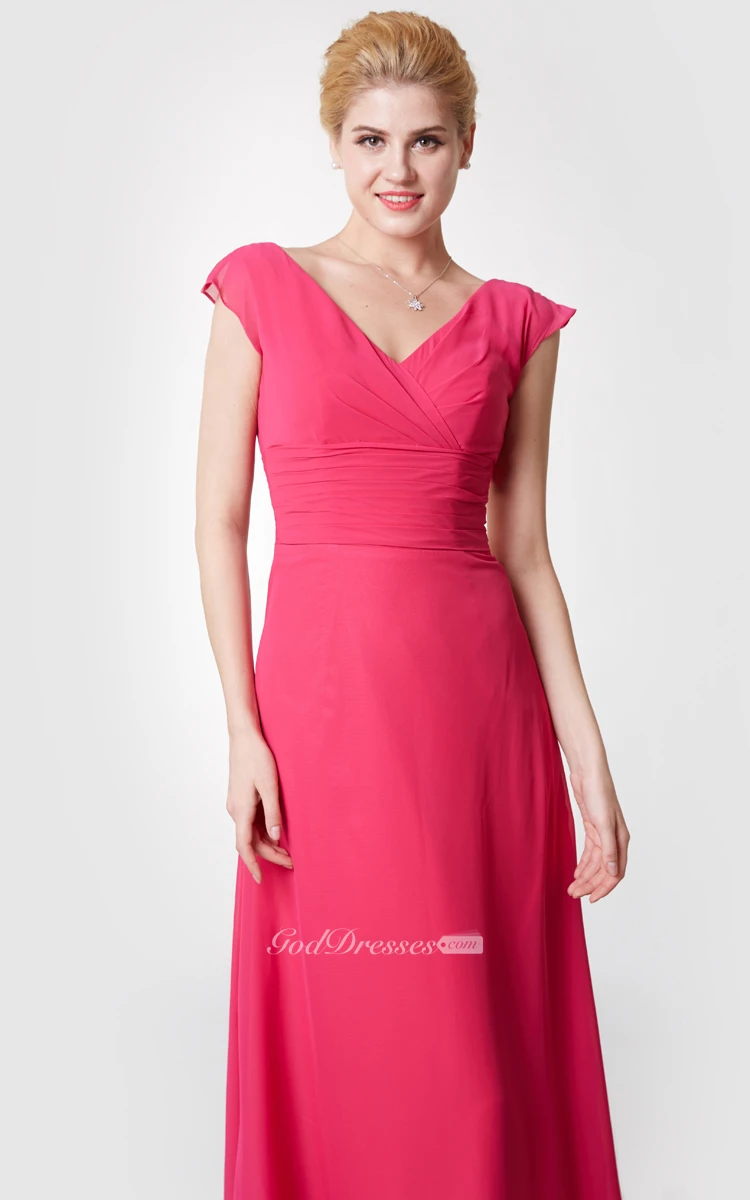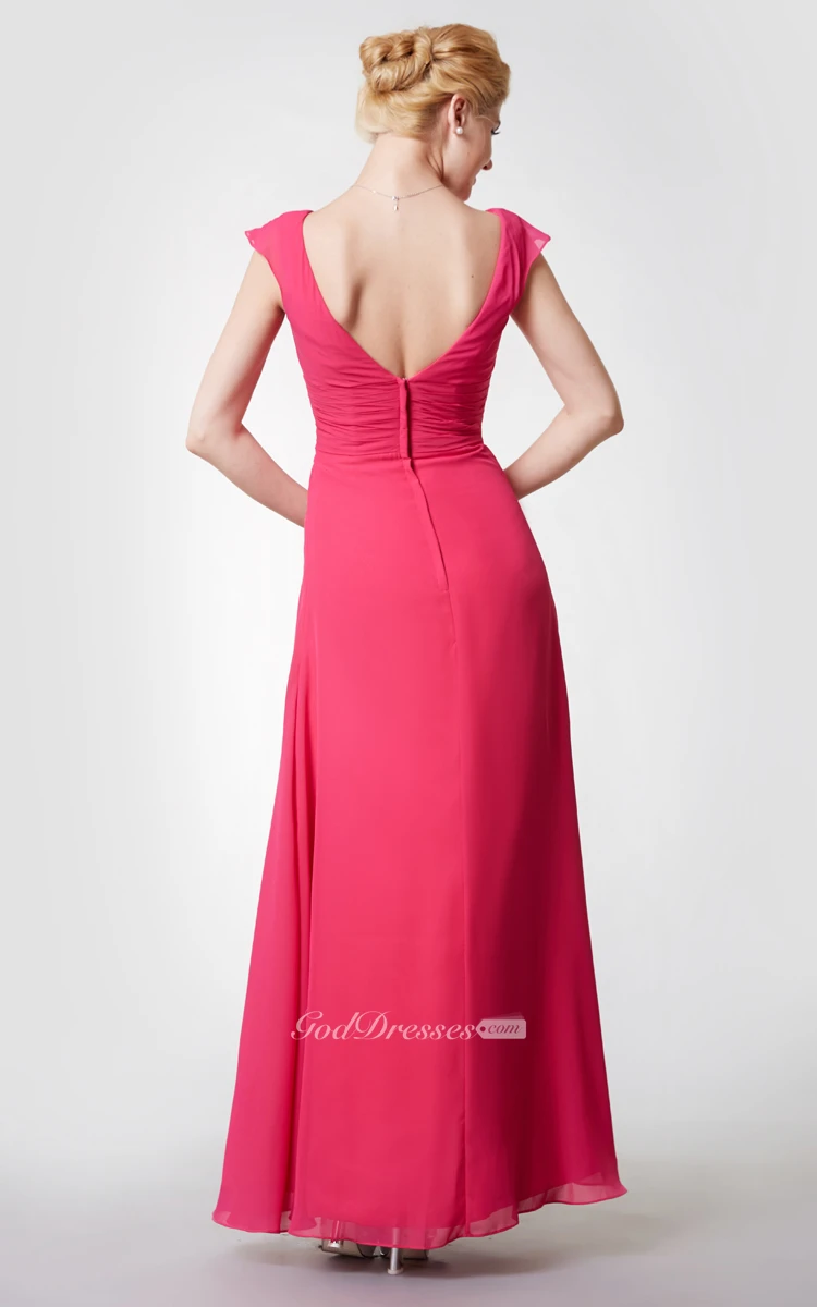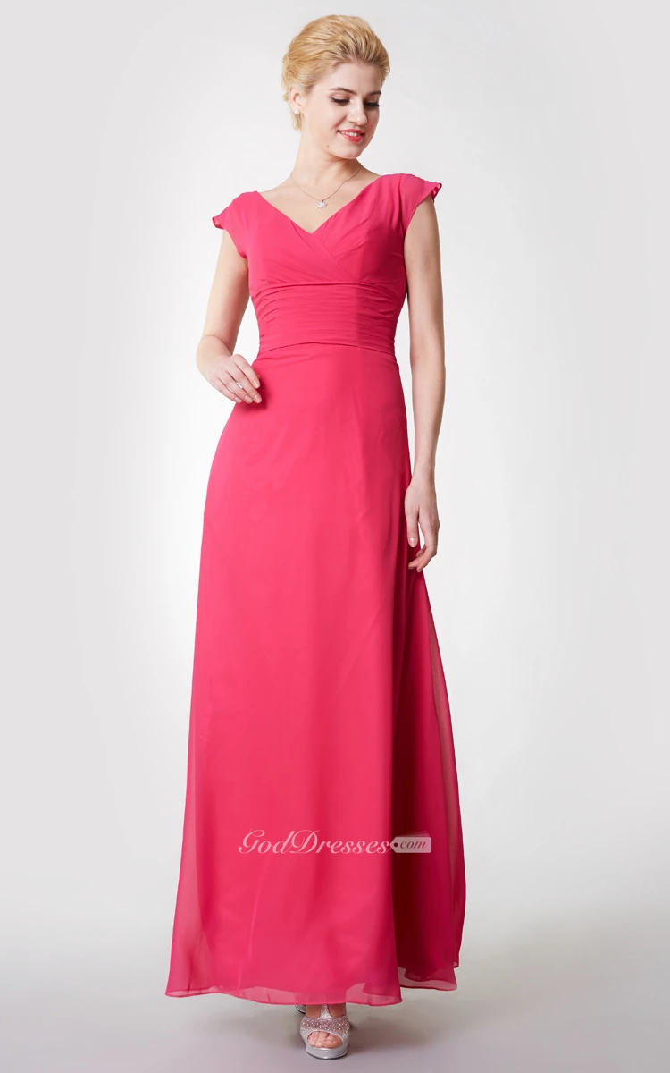 Modern Cap-sleeved Ruched Long Chiffon Dress