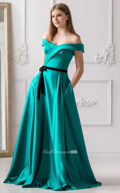 Modern Floor-length Short Sleeve Satin A Line Evening Dress with Sash