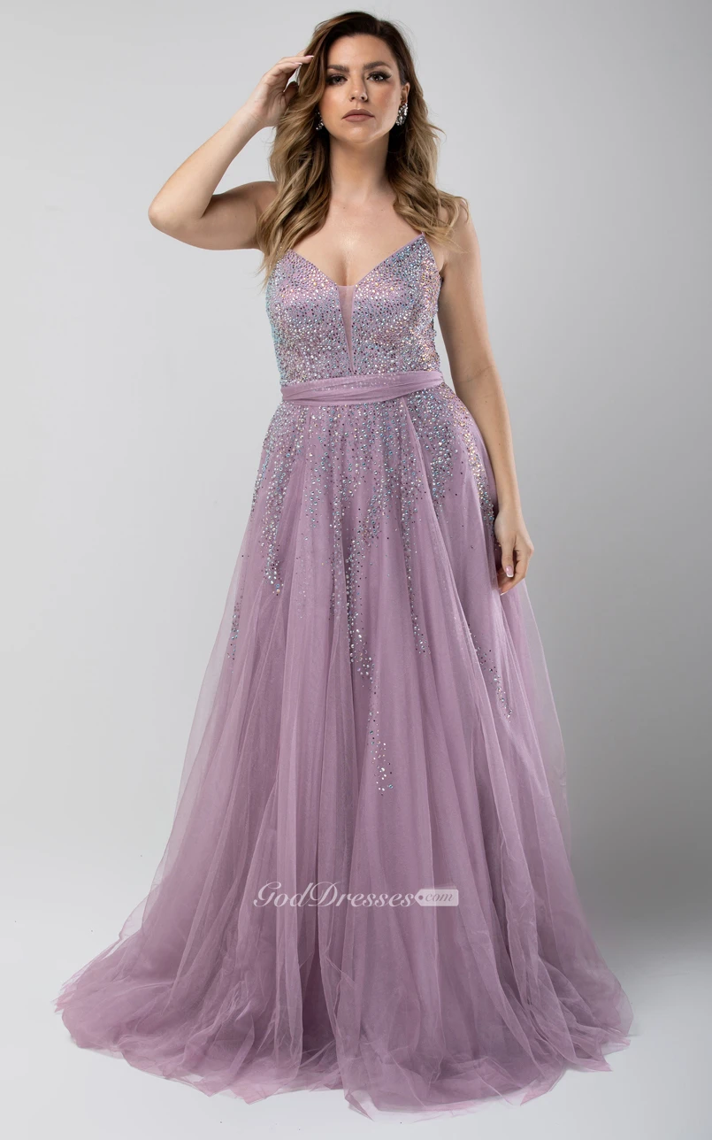 Modern Floor-length Sleeveless Tulle A Line Corset Back Prom Dress with Beading