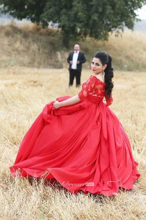 Modern Half Sleeve Red Wedding Dress Lace Sweep Train
