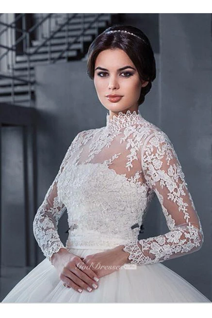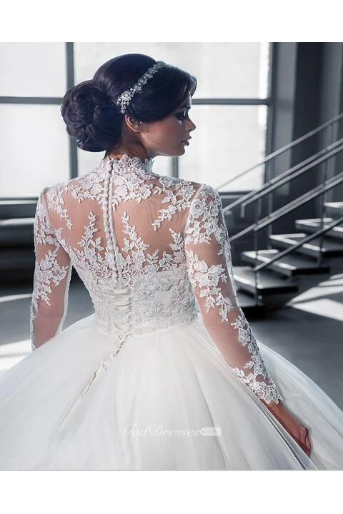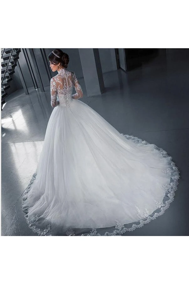 Modern High Neck Lace Appliques Wedding Dress Ball Gown Long Sleeve