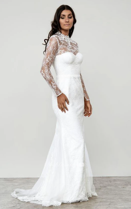 Modern High Neck Lace Mermaid Long Sleeve Floor-length Sweep Train Wedding Dress
