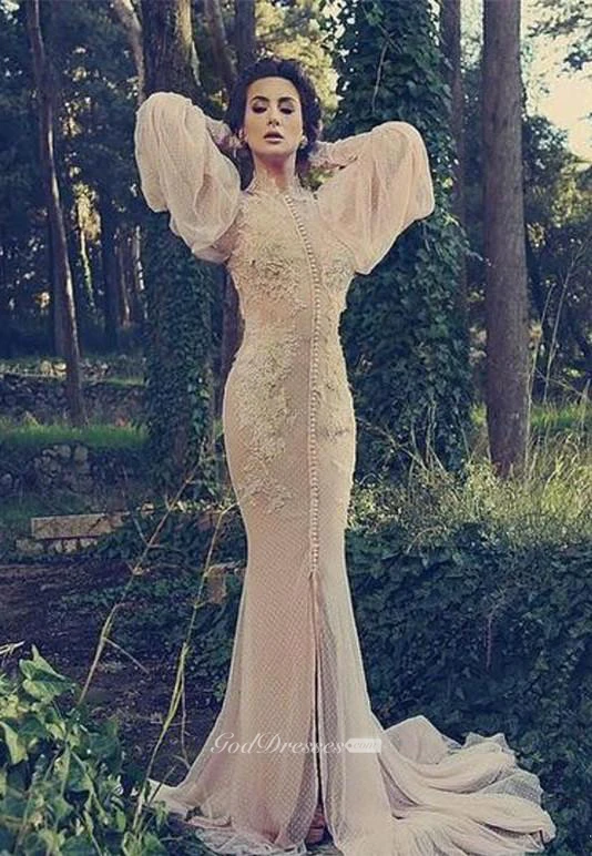 Modern High Neck Long Sleeve Mermaid Prom Dress With Lace Appliques