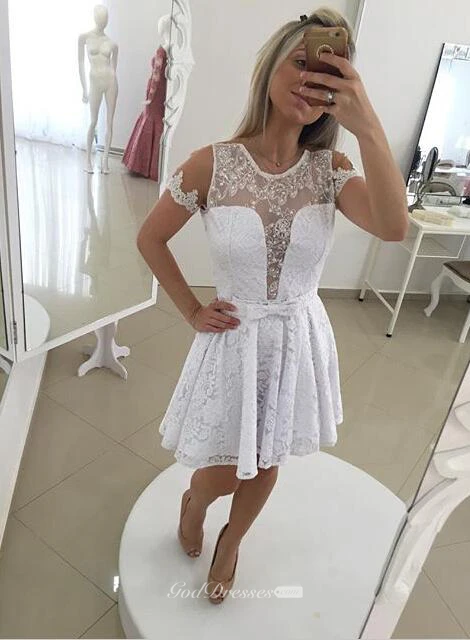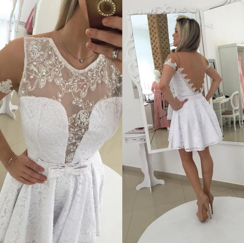 Modern Illusion White Short Cocktail Dress Lace Bowknot