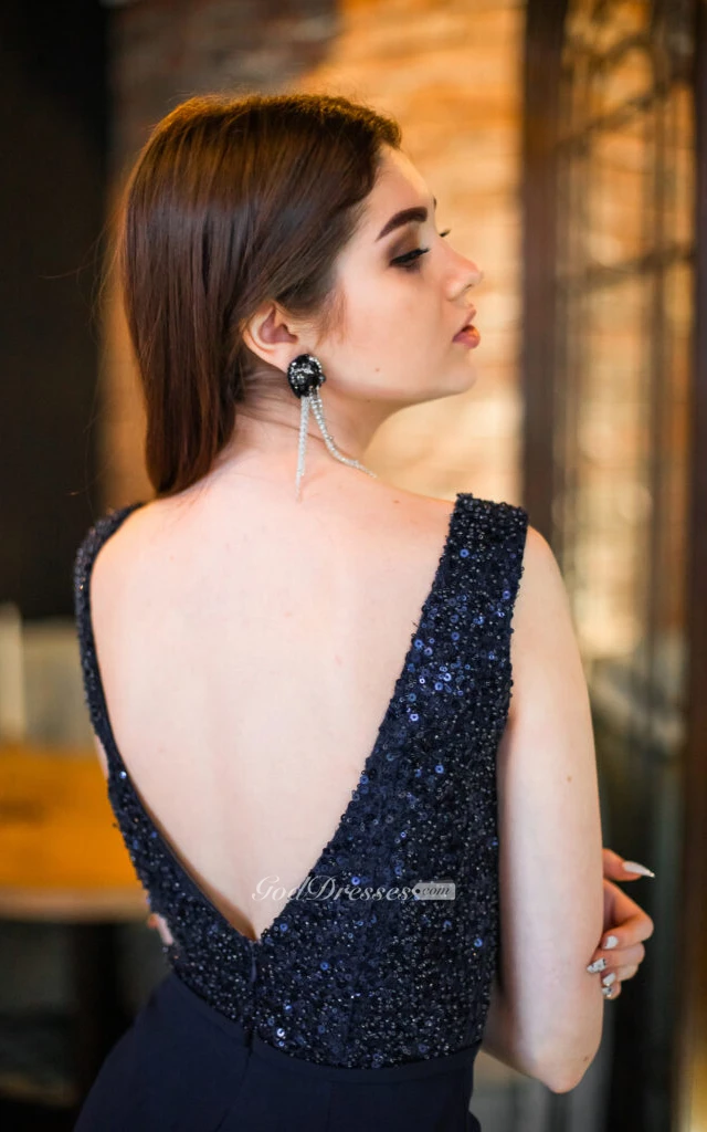 Modern Jersey Plunging Neckline Sleeveless Split Front Formal Dress With Deep-V Back