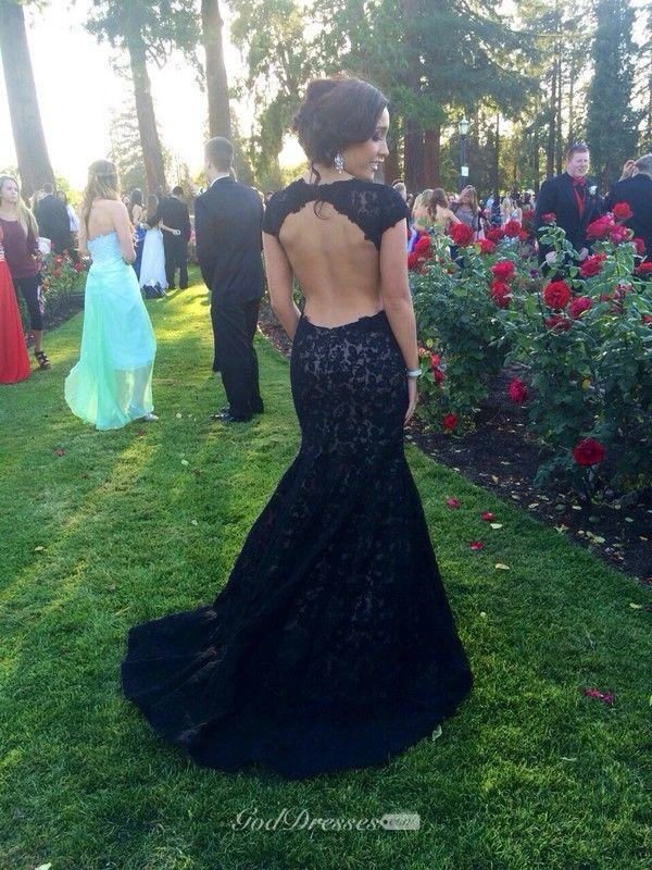 Modern Lace Black Mermaid Prom Dress Sweep Train Cap Sleeve