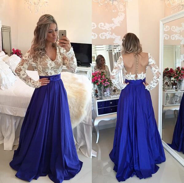 Modern Lace Chiffon Long Sleev Prom Dress Zipper Button Back