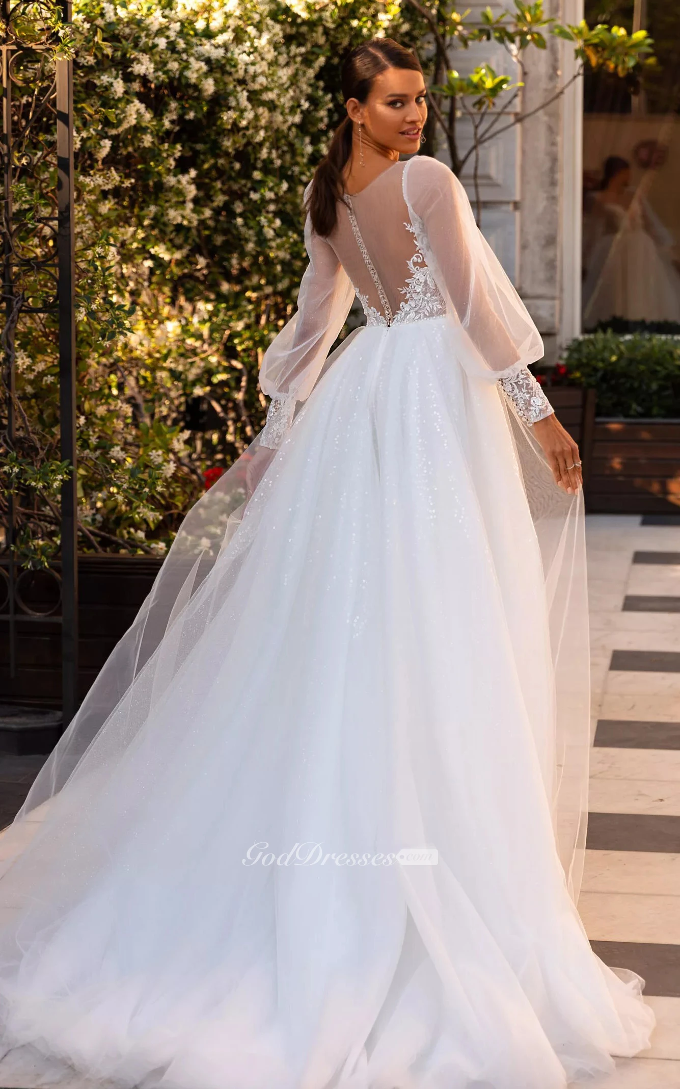 Modern Lace Floor-length Long Sleeve Ball Gown Illusion Wedding Dress with Sequins