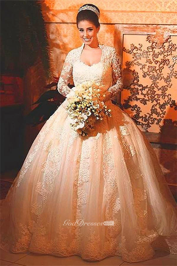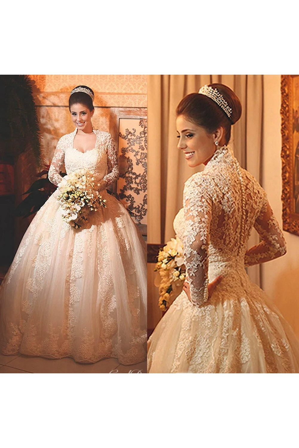 Modern Lace Long Sleeve Wedding Dress Ball Gown Button Zipper Back