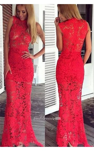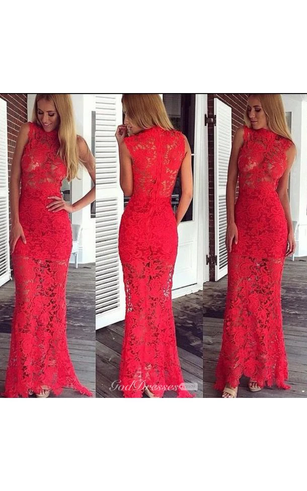 Modern Lace Red Mermaid Prom Dress Zipper Floor-length