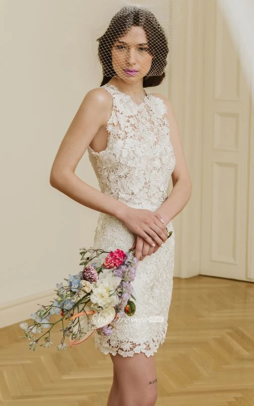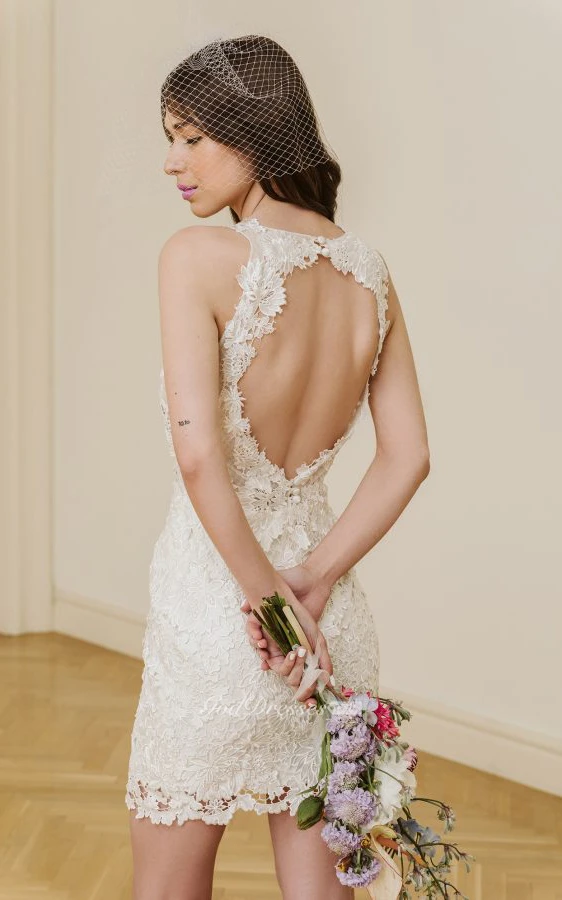 Modern Lace Short Sleeveless A Line Keyhole Wedding Dress