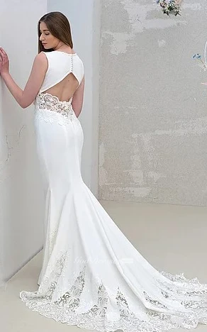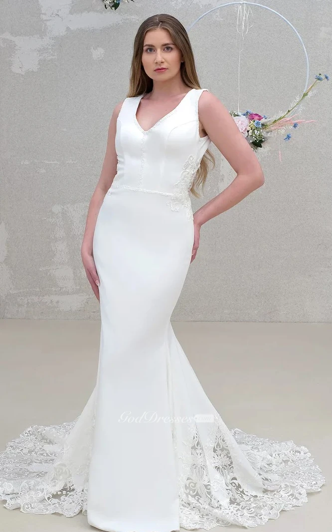 Modern Mermaid V-neck Floor-length Sleeveless Satin Wedding Dress with Appliques