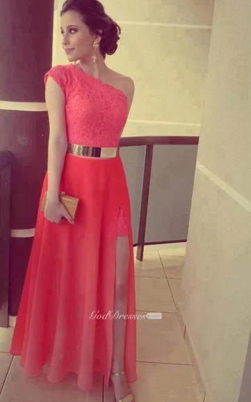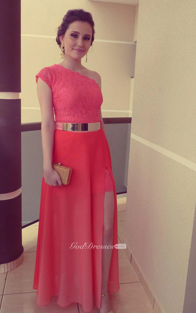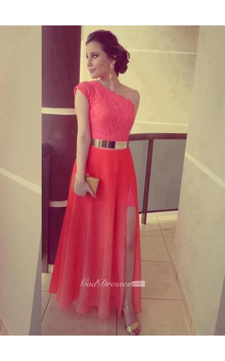 Modern One-shoulder Chiffon Prom Dress With Lace Front Split