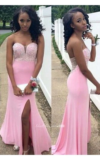 Modern Pink Mermaid Beadings Prom Dress Front Split Sweep Train