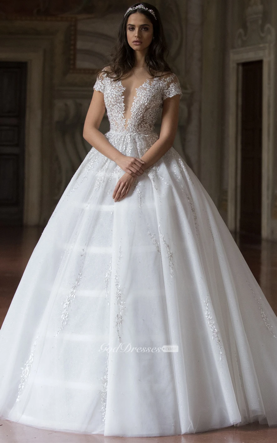 Modern Plunging Neckline Ball Gown Tulle Floor-length Short Sleeve Wedding Dress with Appliques