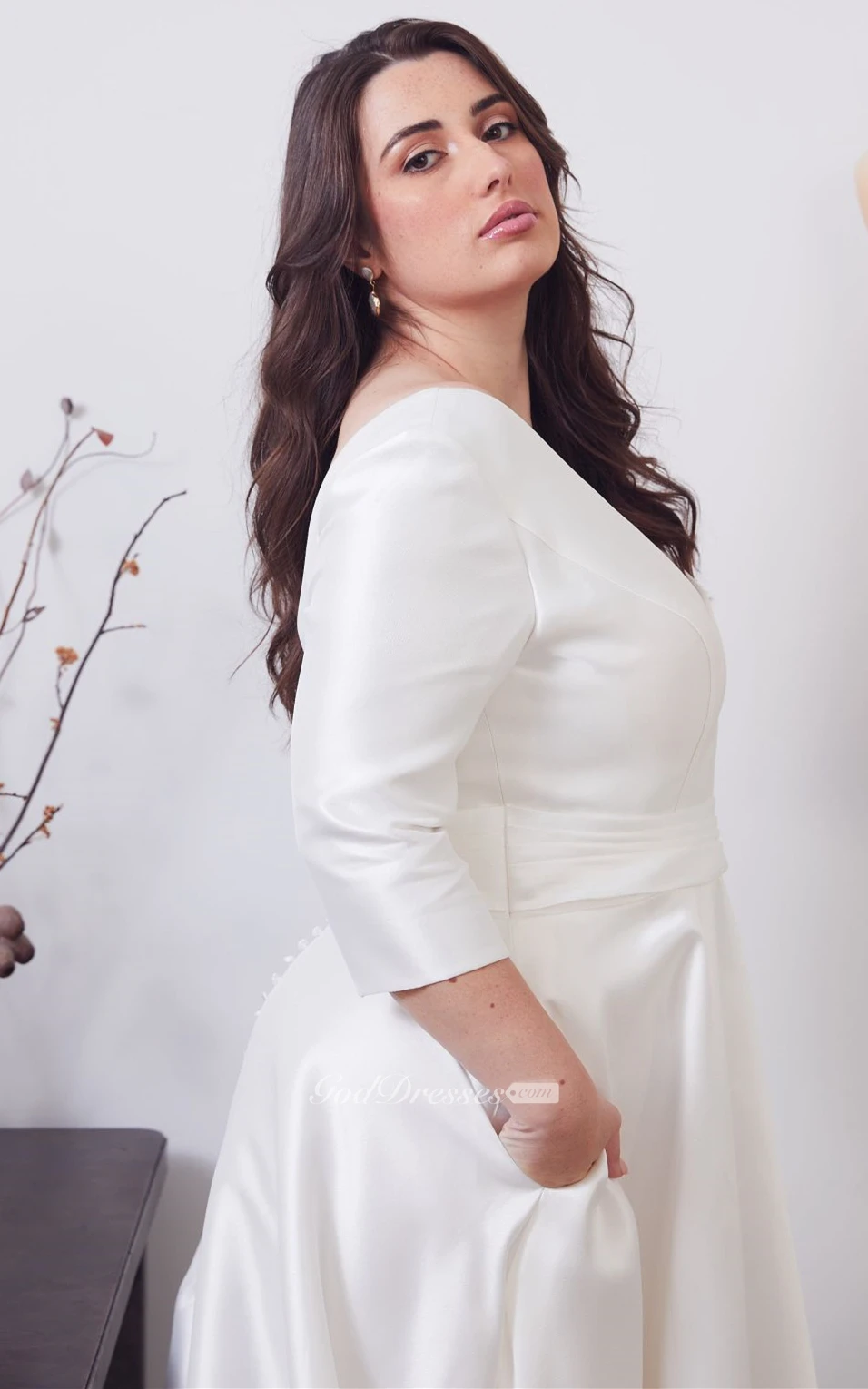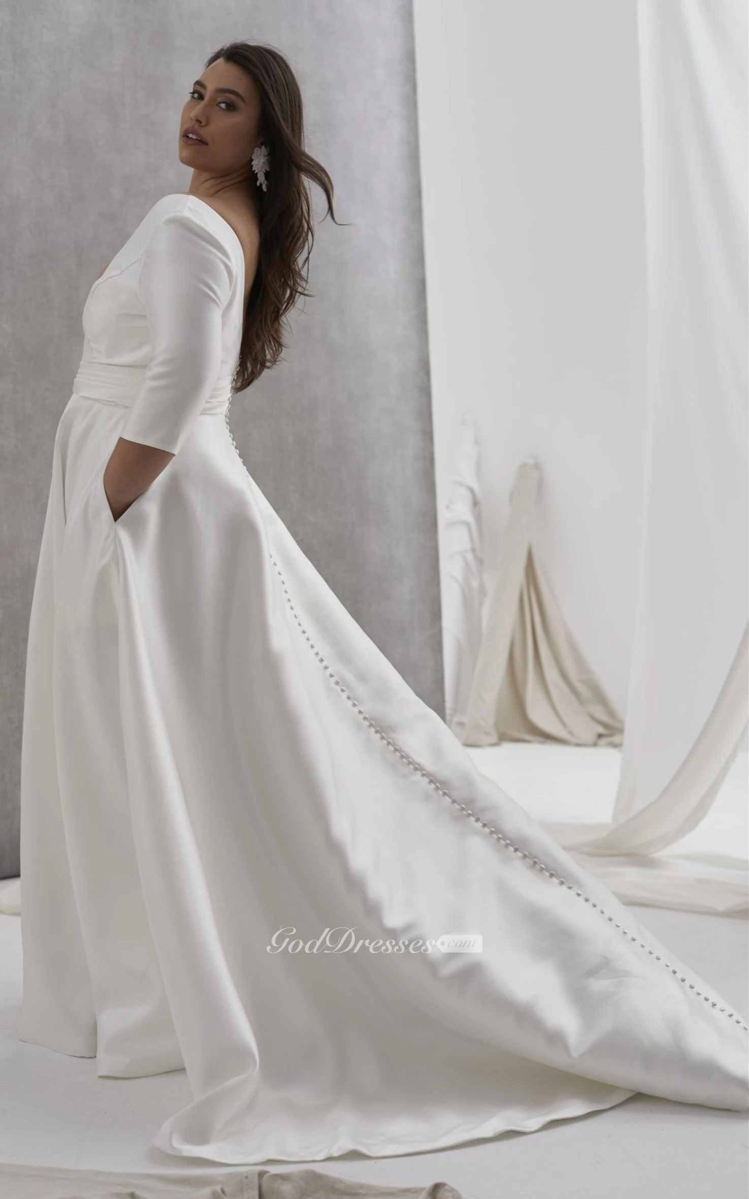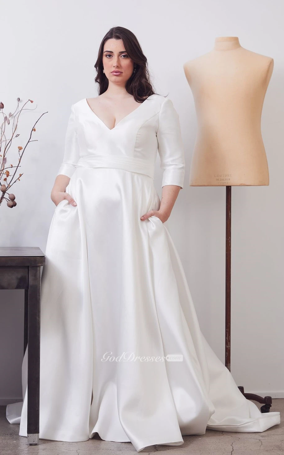 Modern Plus Size V-neck A Line Satin Wedding Dress with Pockets