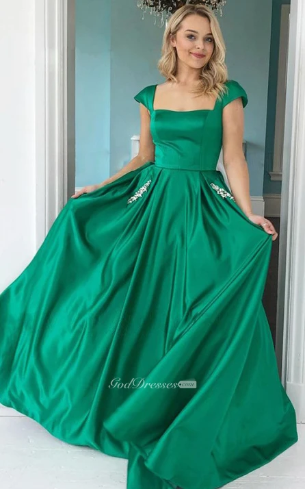 Modern Satin A Line Square Short Sleeve Prom Guest Evening Formal Dress