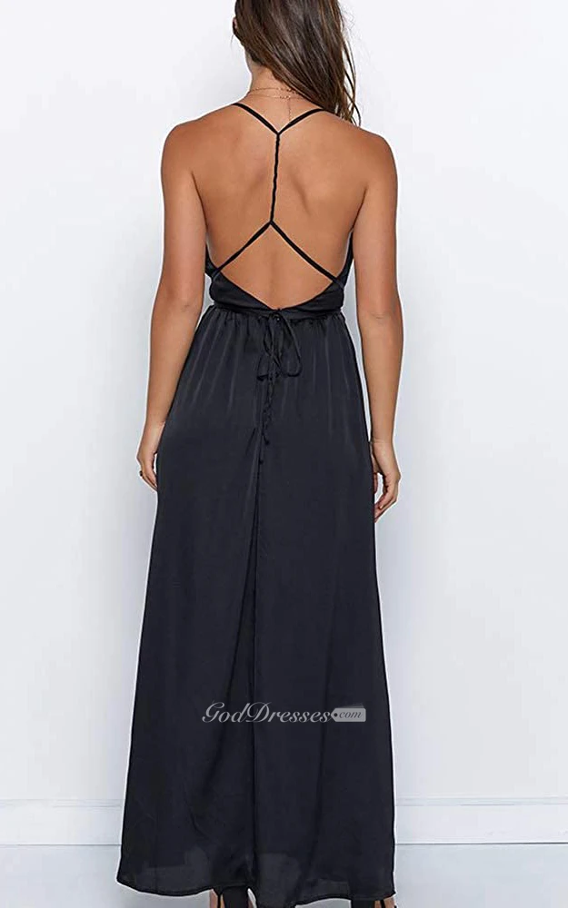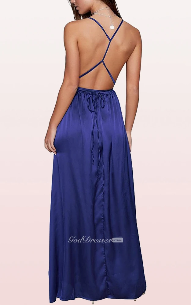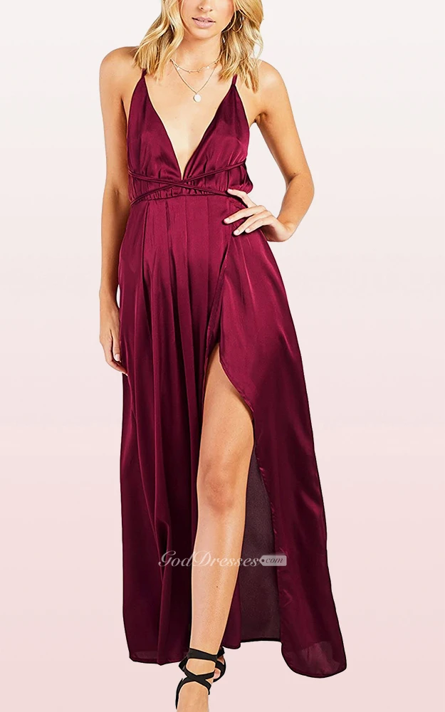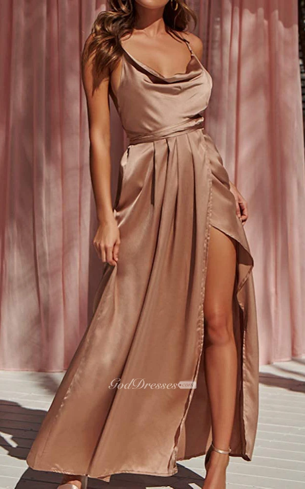 Modern Satin V-neck Cowel A Line Guest Dress With Ruffles and Split Front