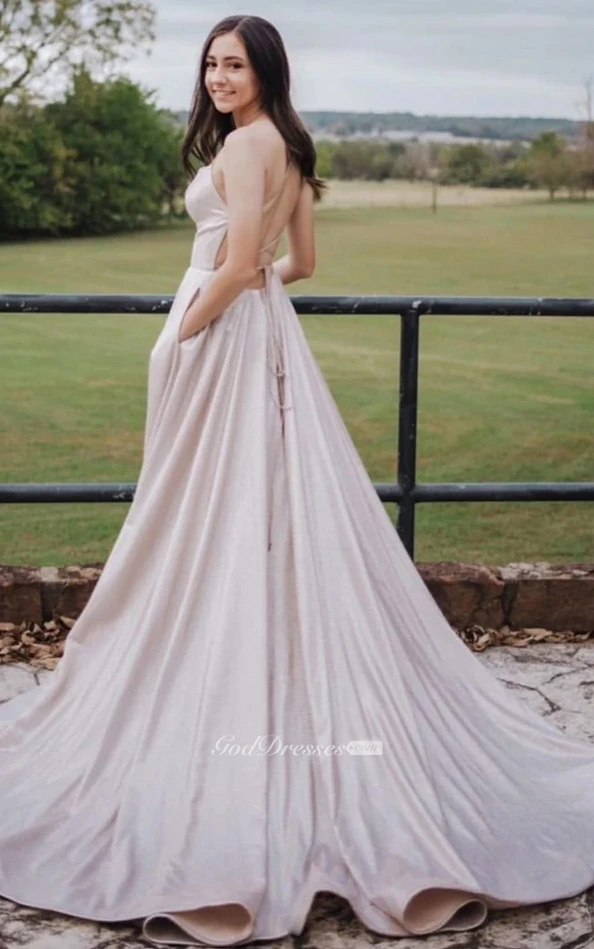 Modern Sleeveless Court Train A Line Satin Tied Back Formal Dress with Pockets