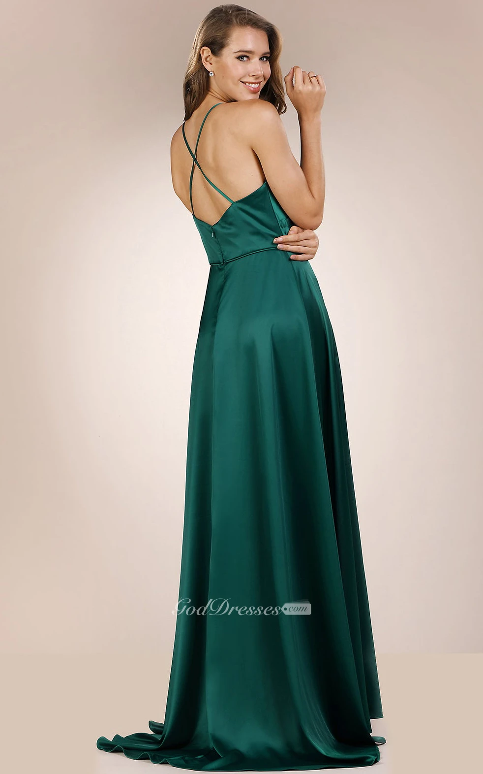 Modern Sleeveless Floor-length A Line Satin Backless Formal Dress with Split Front
