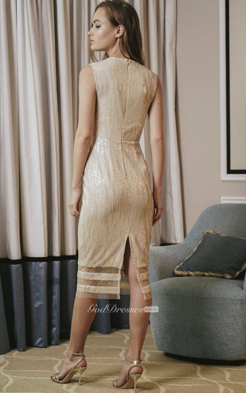 Modern Sleeveless Tea-length Sheath Sequins Zipper Cocktail Dress with Split Back