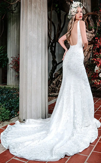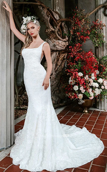 Modern Square Trumpet Lace Floor-length Sleeveless Wedding Dress