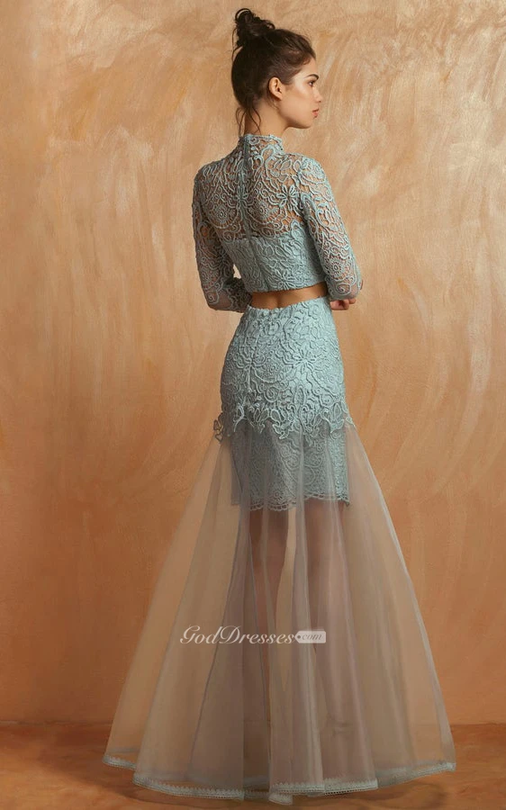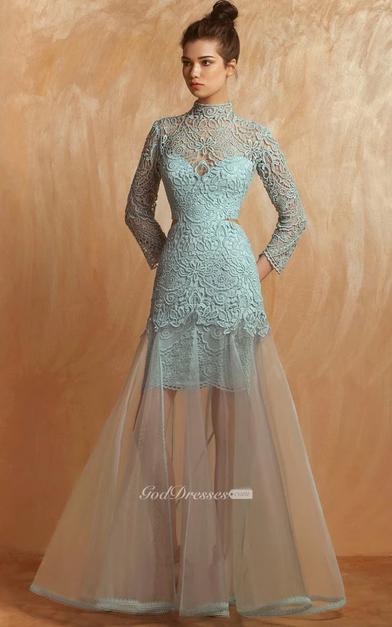 Modern Tulle High Neck Long Sleeve Appliques Evening Dress With Zipper