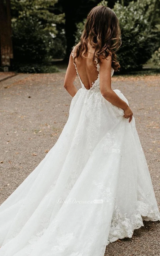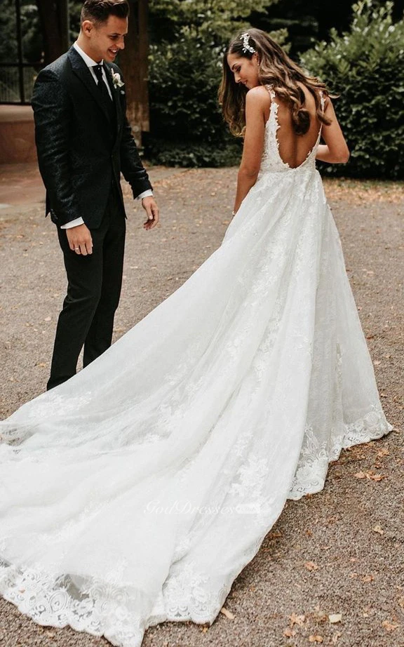 Modern V-neck Lace A Line Floor-length Court Train Sleeveless Wedding Dress with Appliques