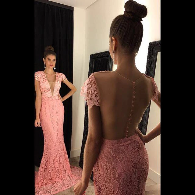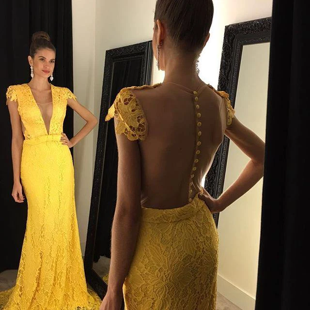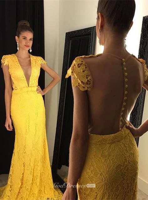 Modern Yellow V-neck Prom Dress Cap Sleeve Lace