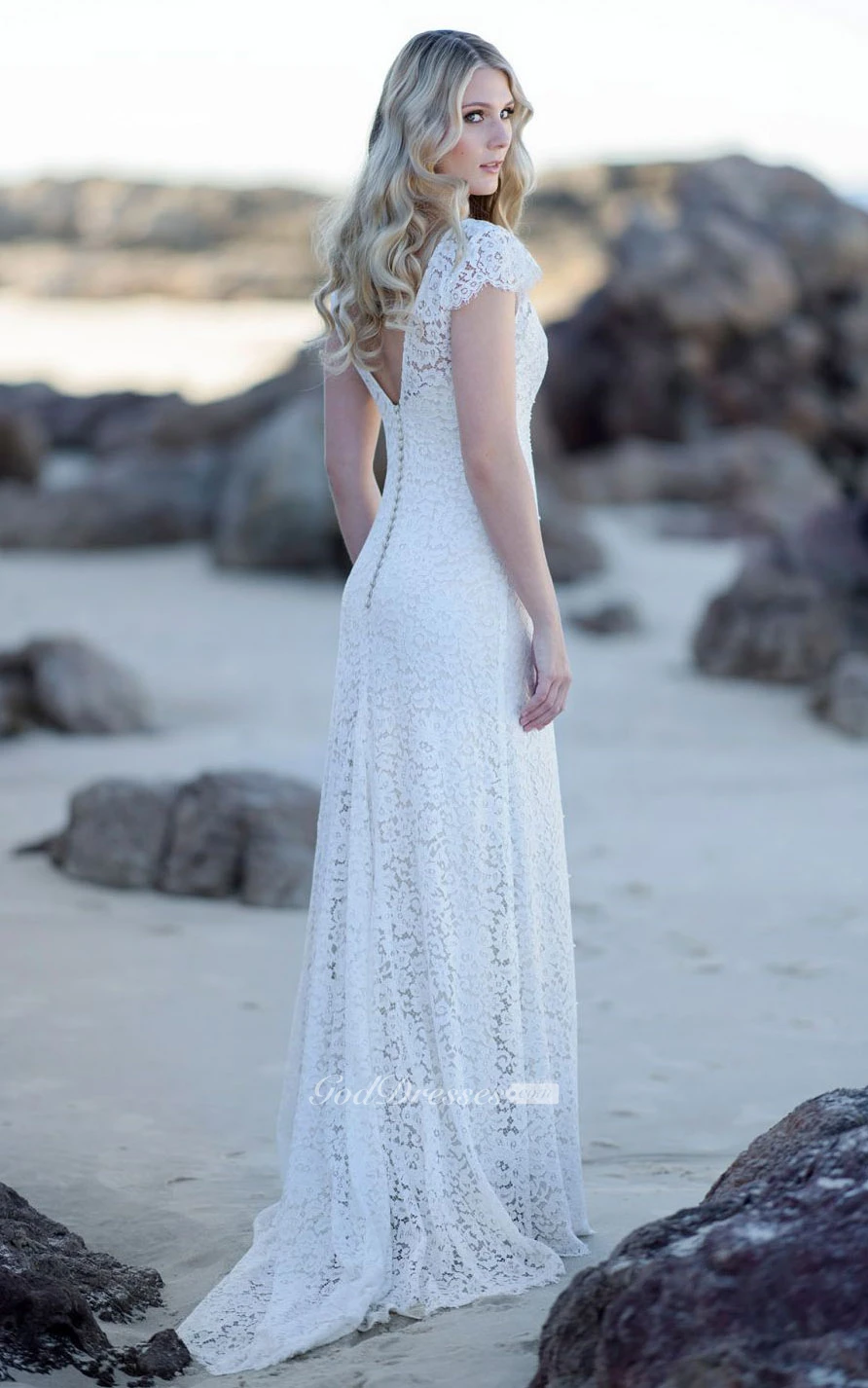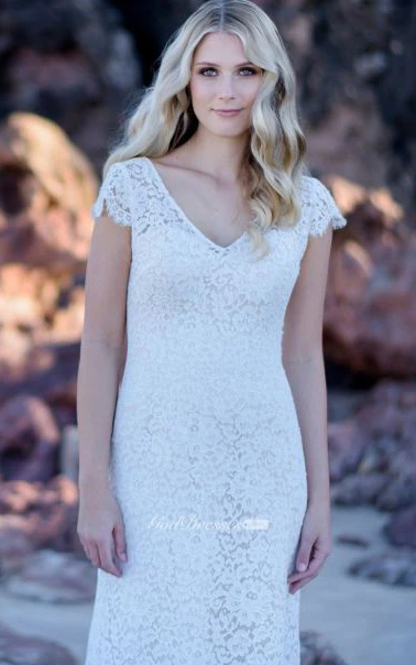 Modest Sheath V-neck Lace Floor-length Low-V Back Wedding Dress