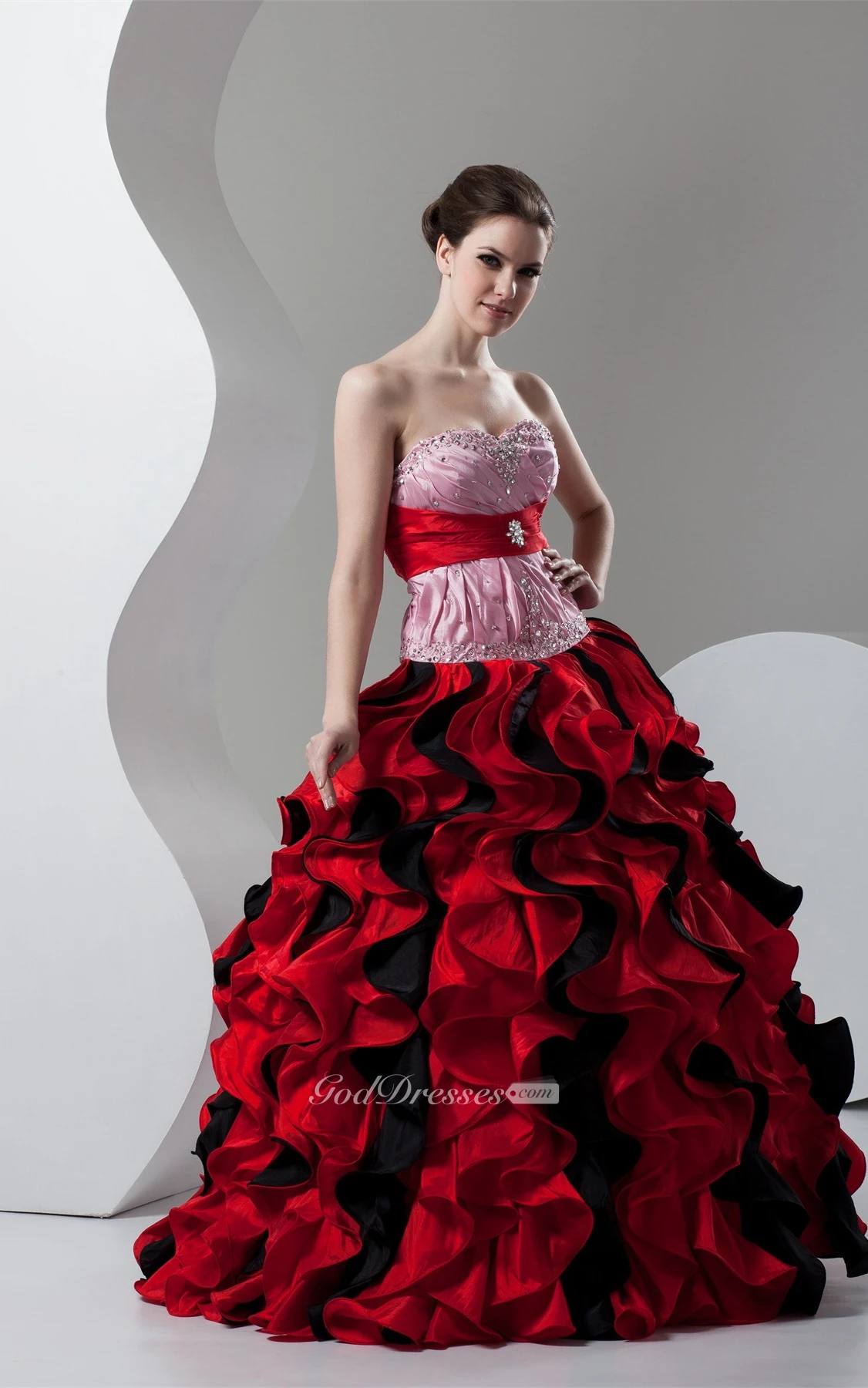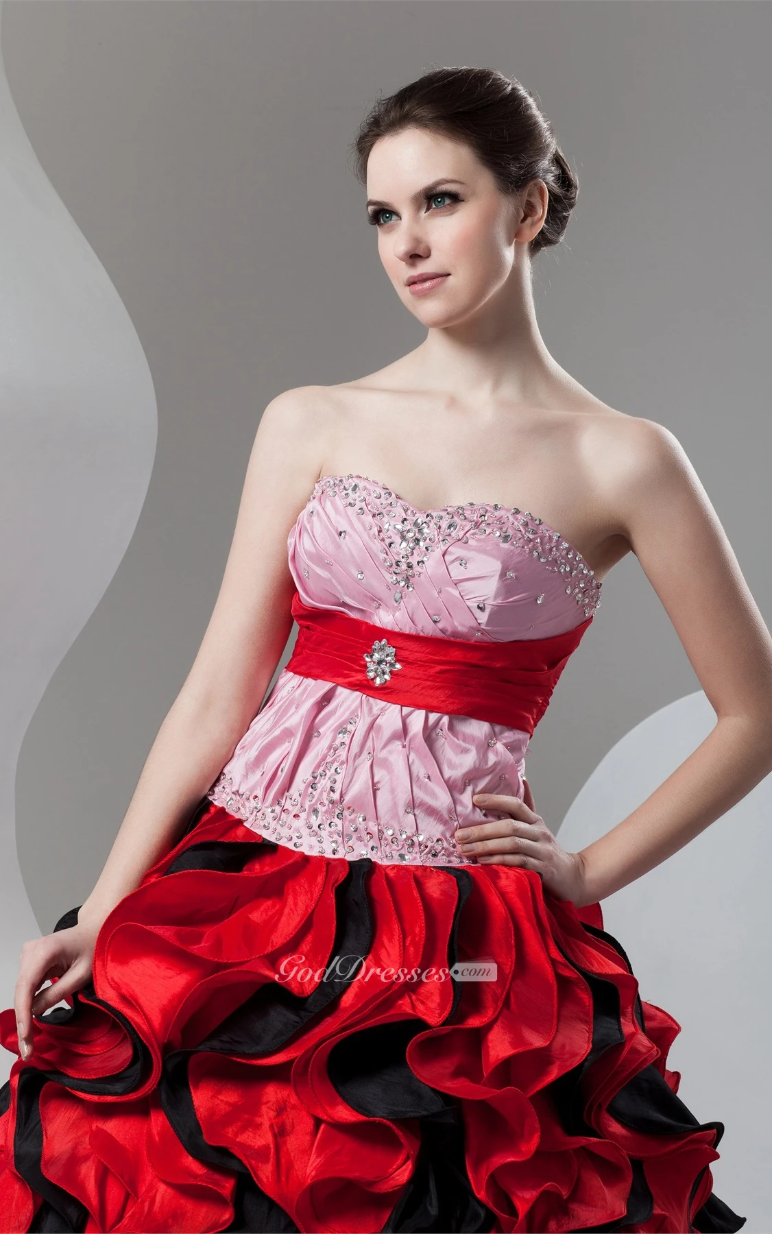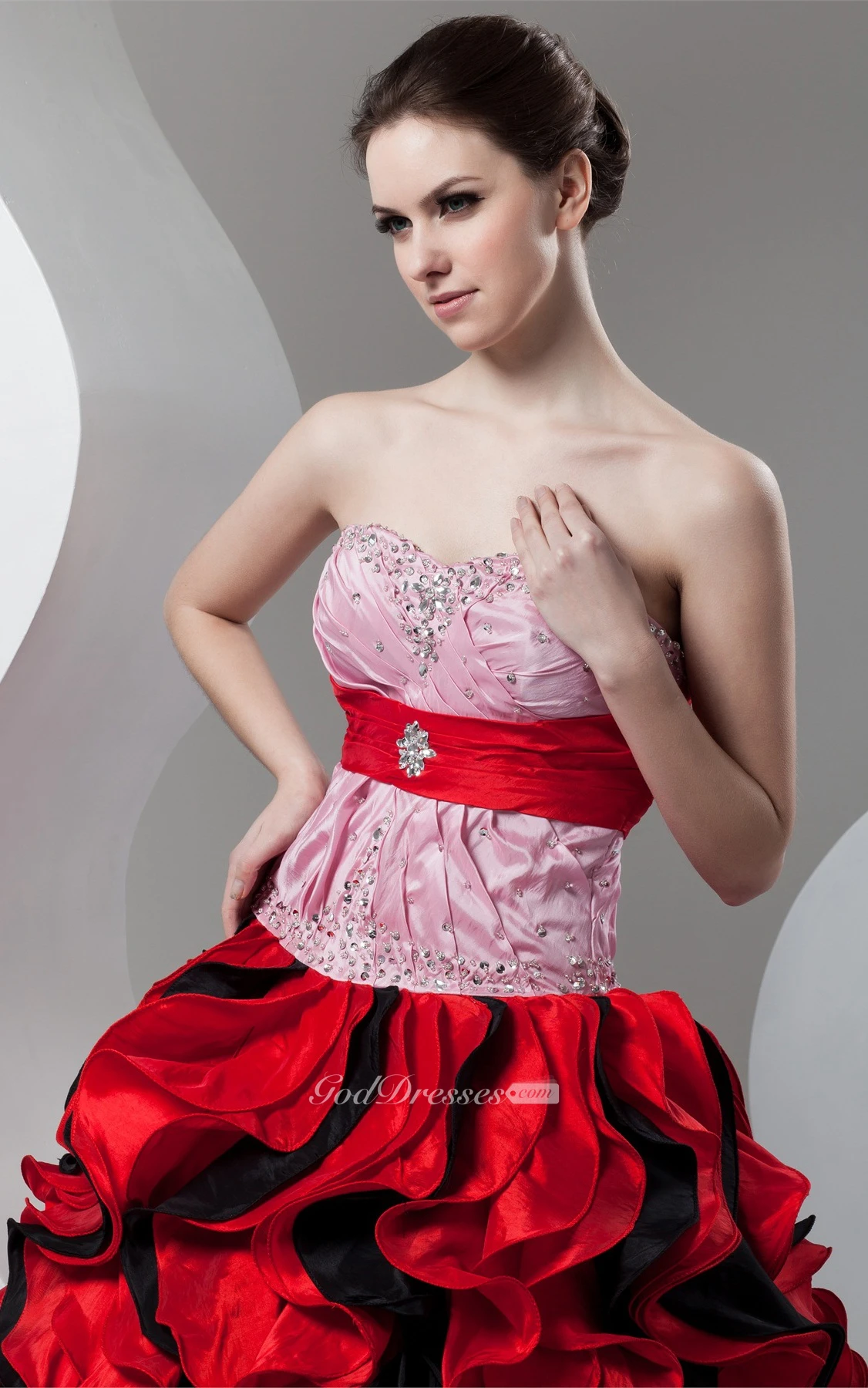 Mute-Color Ruffled Stress and Ball-Gown With Broach
