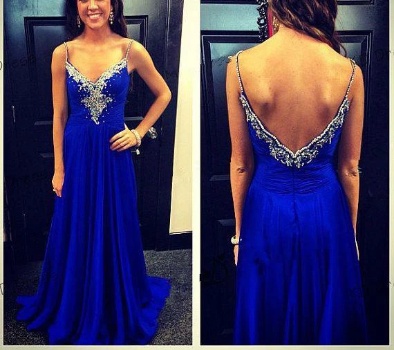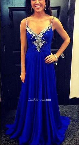 Newest Beadings Chiffon Royal Blue Prom Dress Zipper Spaghetti Strap