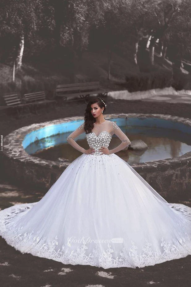 Newest Crystals Tulle Lace Illusion Wedding Dress Long Sleeve Ball Gown