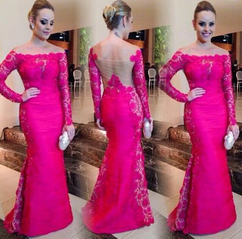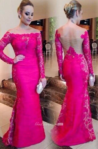 Newest Fuchsia Long Sleeve Mermaid Evening Dress Lace Off-the-shoulder