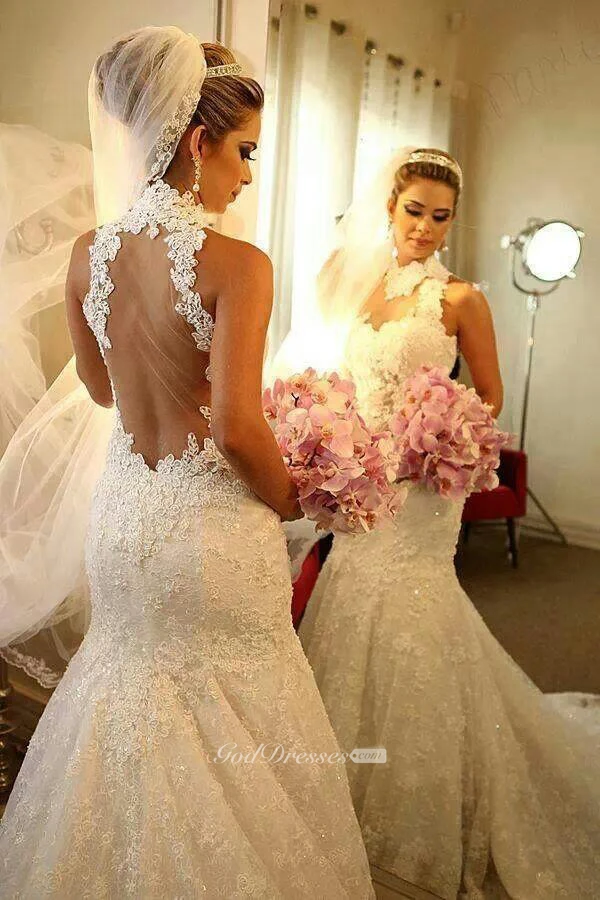 Newest High Neck Mermaid Wedding Dress Lace Appliques Court Train